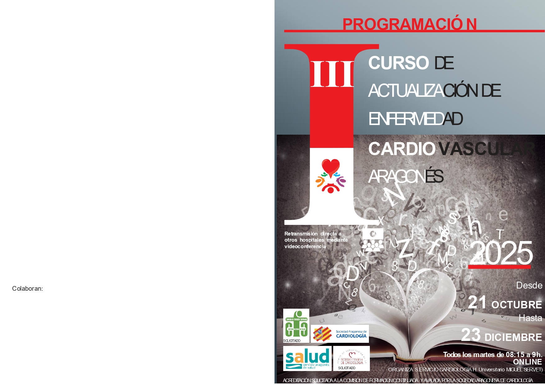 Del 21 de octubre al 23 de diciembre de 2025, se celebra «III CURSO DE ACTUALIZACION CARDIOVASCULAR ARAGONES», organizado por el Servicio de Cardiologia del Hospital Universitario Miguel Servet. En formato telematico con enlace en todos los hospitales de Aragón Os esperamos